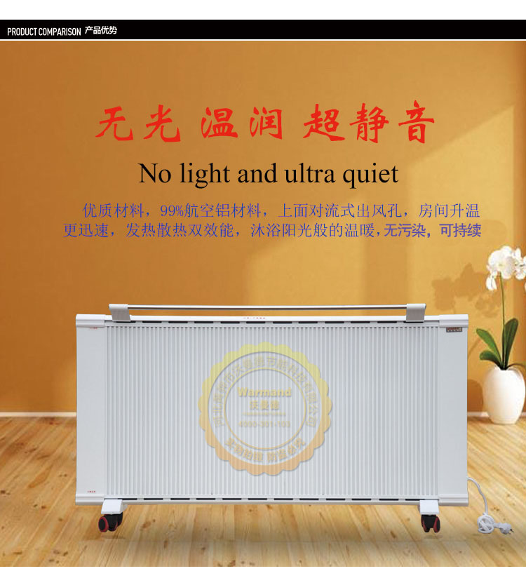 優(yōu)勢二:舒適!碳晶遠紅外電暖器使用中無“小太陽”光照污染問題,無空調或者熱風機噪音、揚塵問題。